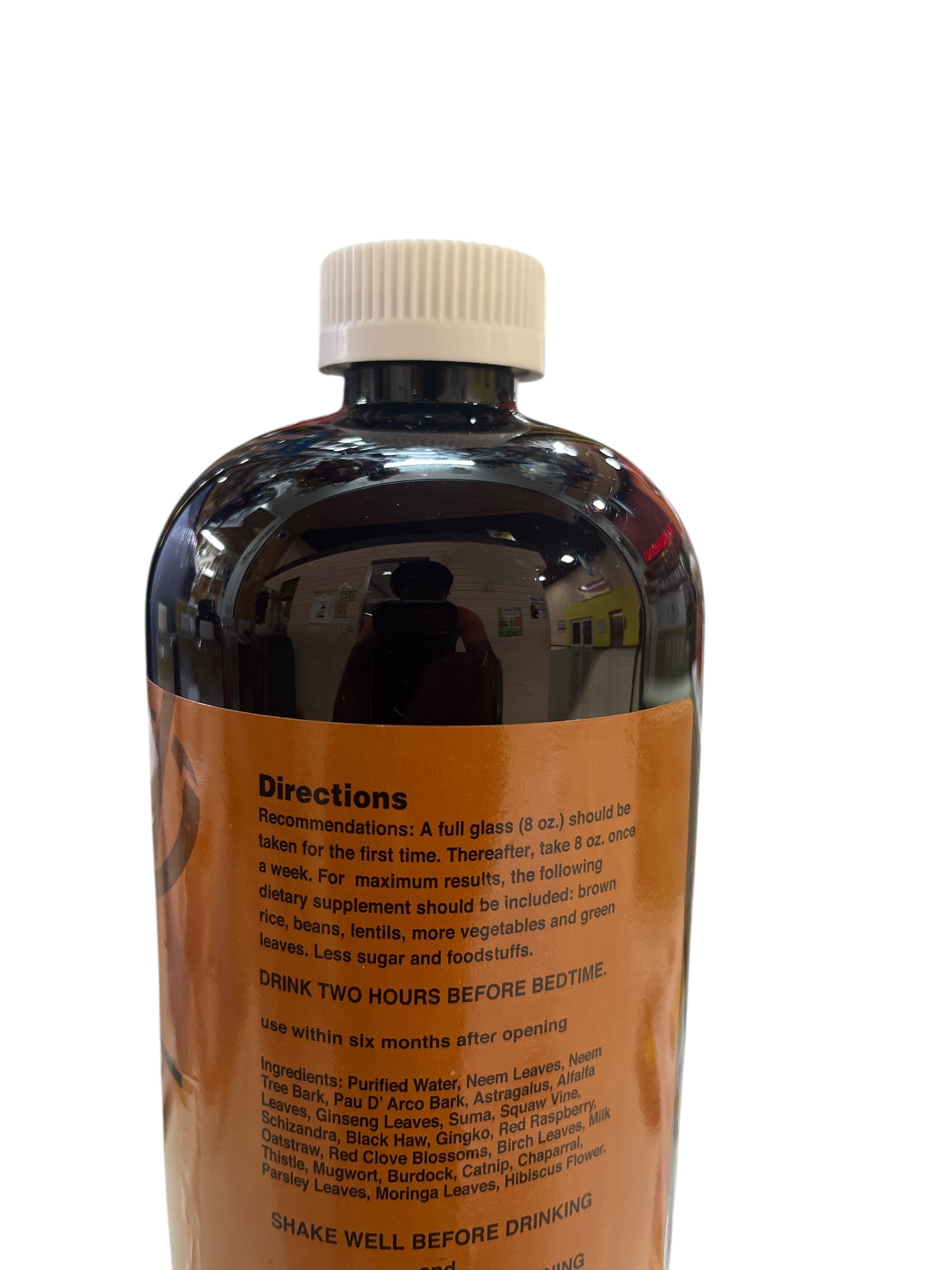 Purified Water, Neem Leaves, Neem Tree Bark, Pau D’Arco Bark, Astragalus, Alfalfa Leaves, Ginseng Leaves, Suma, Squaw Vine, Schizandra, Black Haw, Ginkgo, Red Raspberry, Oatstraw, Black Cohosh, Blessed Thistle, Milk Thistle, Red Clover Blossoms, Peach Leaves, Hawthorn, Mugwort, Burdock, Catnip, Chaparral, Parsley Leaves, Moringa Leaves, Hibiscus Flower.